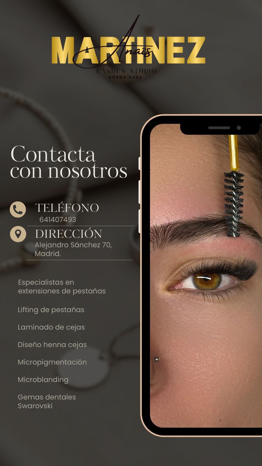 En Anaís Martínez Studio, ofrecemos una amplia gama de servicios estéticos diseñados para realzar tu belleza natural. Especializándonos en extensiones de pestañas, microblading y micropigmentación de cejas, así como en el diseño de cejas con henna y laminado. También realizamos depilación con hilo y lifting de pestañas, tanto con tinte como sin tinte. Además, brindamos mentoría en extensiones de pestañas y cursos de técnico en joyería dental, incluyendo la colocación de joyas Swarovski en los dientes, todo en un ambiente profesional y acogedor en Carabanchel.